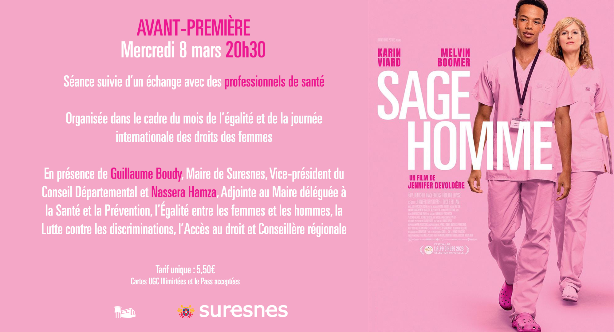 L'événement majeur du 8 mars 2023, au sein de la commune de Suresnes, sera ainsi l'avant-première débat du film « Sage-homme » de Jennifer Devoldere, à 20h30, au Cinéma Le Capitole, 3 Rue Ledru Rollin à Suresnes, en présence de Guillaume BOUDY, Maire de Suresnes et Vice-président du Conseil Départemental et de Nassera HAMZA, Adjointe au Maire déléguée à la Santé et la Prévention, l'Égalité entre les femmes et les hommes, la Lutte contre les discriminations, l'Accès au droit et Conseillère régionale.